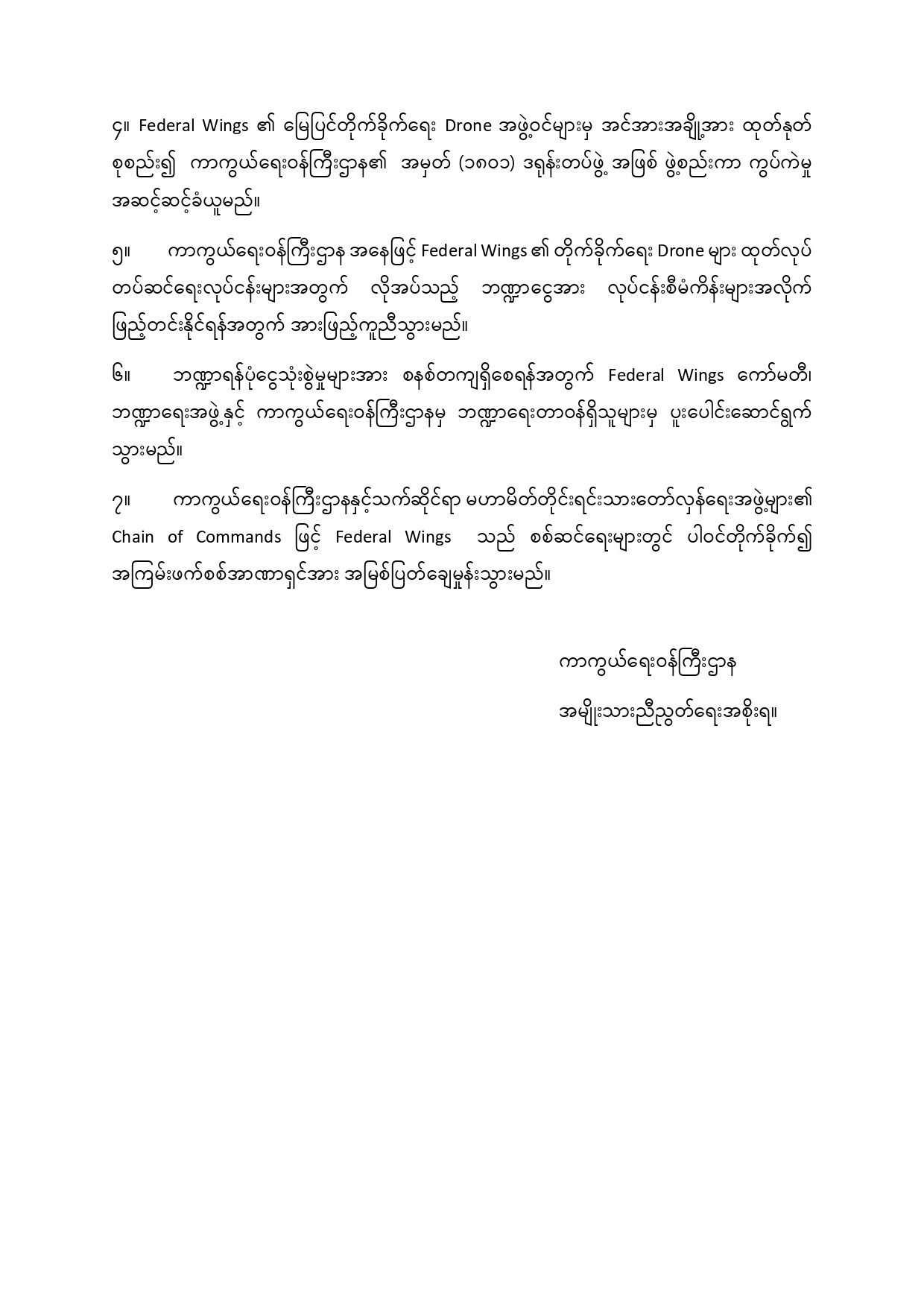 ၇။ ကာကွယ်ရေးဝန်ကြီးဌာနနှင့်သက်ဆိုင်ရာ မဟာမိတ်တိုင်းရင်းသားတော်လှန်ရေးအဖွဲ့များ၏ Chain of Commands ဖြင့် Federal Wings သည် စစ်ဆင်ရေးများတွင် ပါဝင်တိုက်ခိုက်၍ အကြမ်းဖက်စစ်အာဏာရှင်အား အမြစ်ပြတ်ချေမှုန်းသွားမည်။