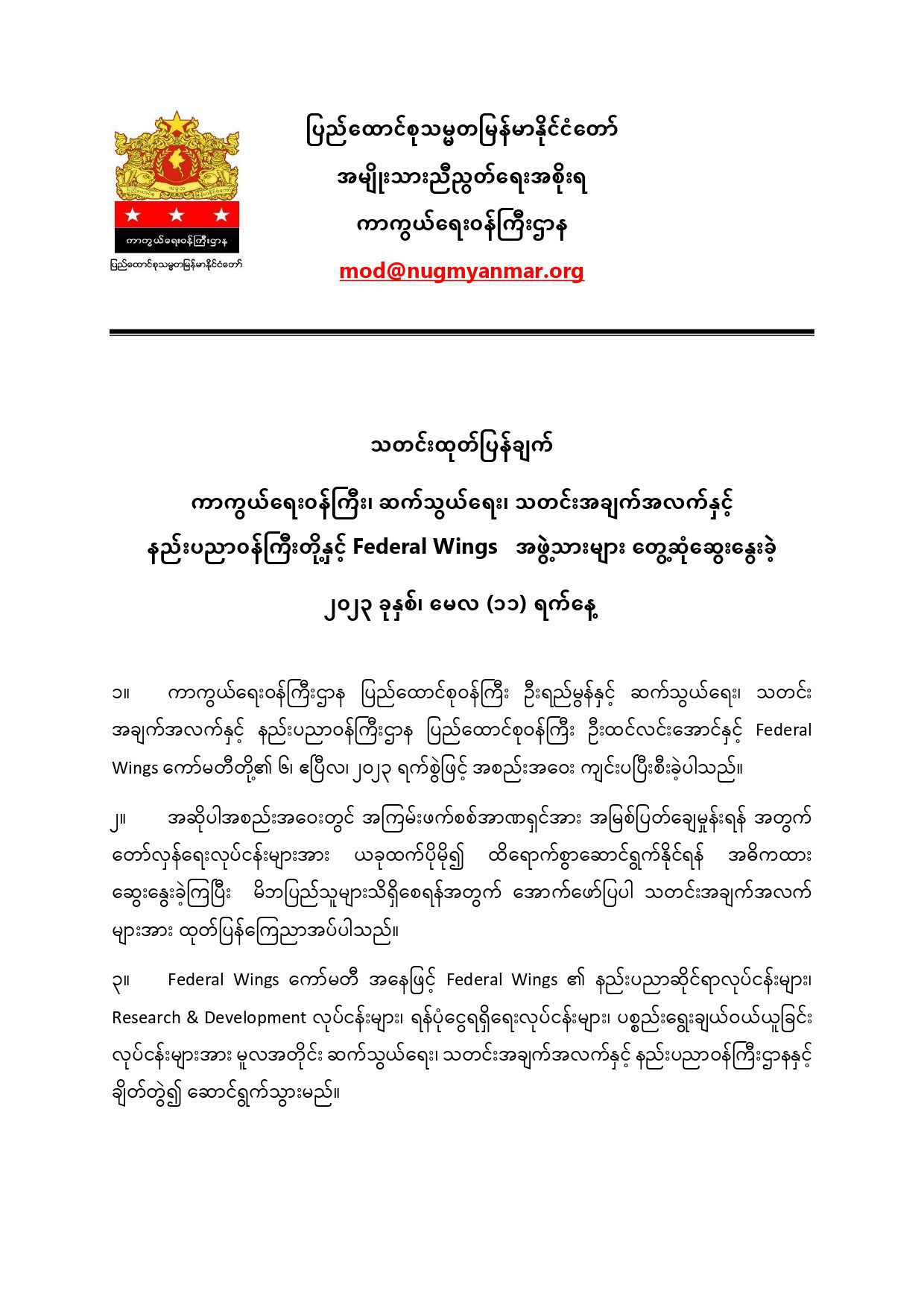 ၃။ Federal Wings ကော်မတီ အနေဖြင့် Federal Wings ၏ နည်းပညာဆိုင်ရာလုပ်ငန်းများ၊ Research & Development လုပ်ငန်းများ၊ ရန်ပုံငွေရရှိရေးလုပ်ငန်းများ၊ ပစ္စည်းရွေးချယ်ဝယ်ယူခြင်း လုပ်ငန်းများအား မူလအတိုင်း ဆက်သွယ်ရေး၊ သတင်းအချက်အလက်နှင့် နည်းပညာဝန်ကြီးဌာနနှင့် ချိတ်တွဲ၍ ဆောင်ရွက်သွားမည်။
