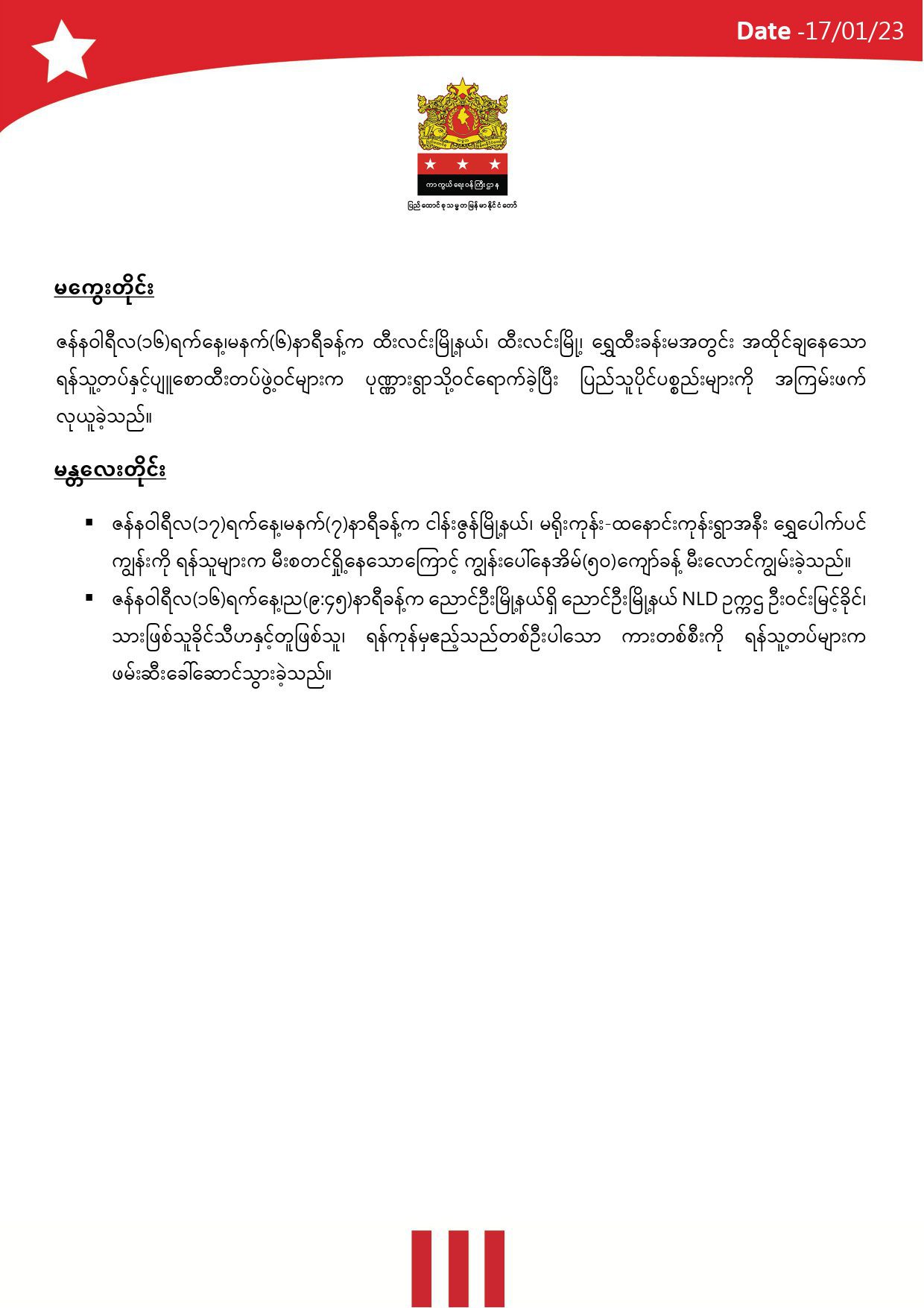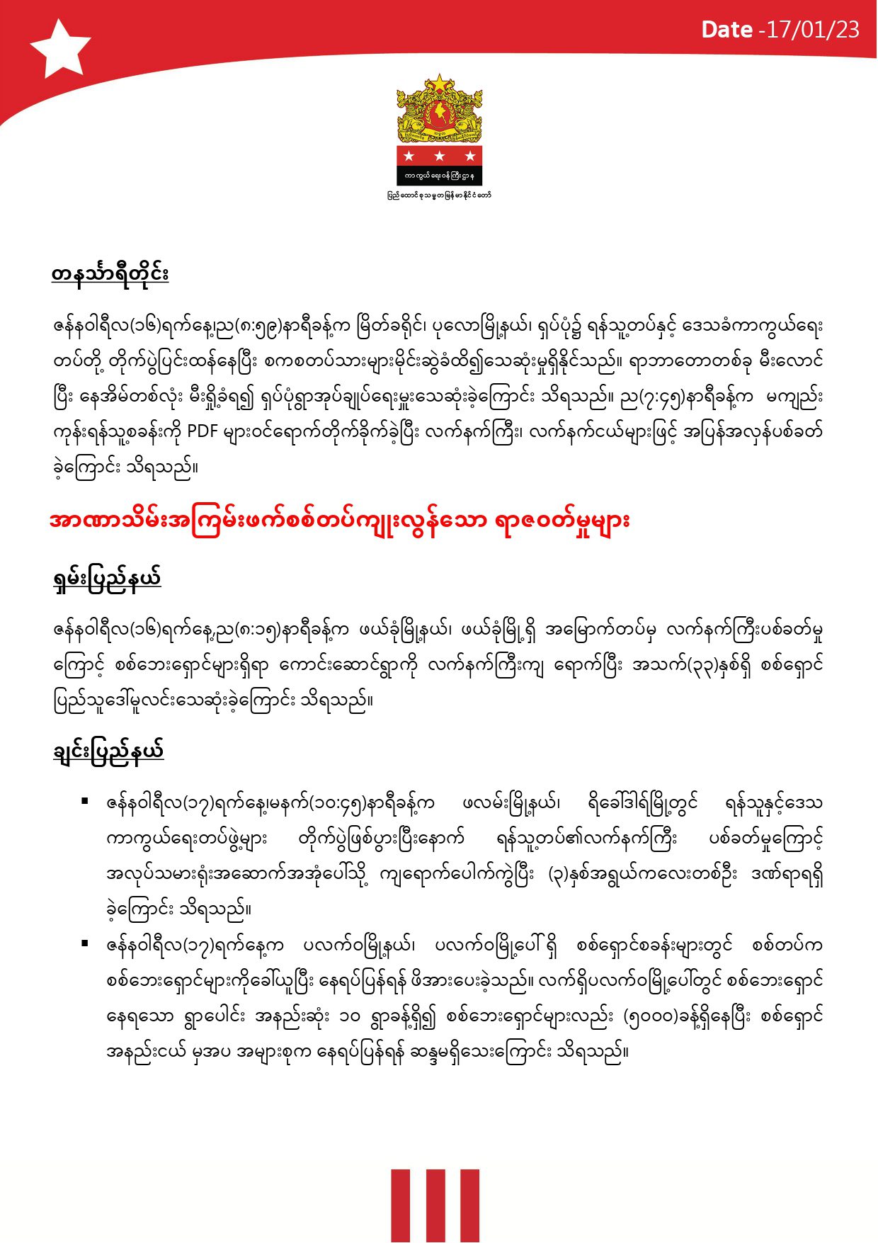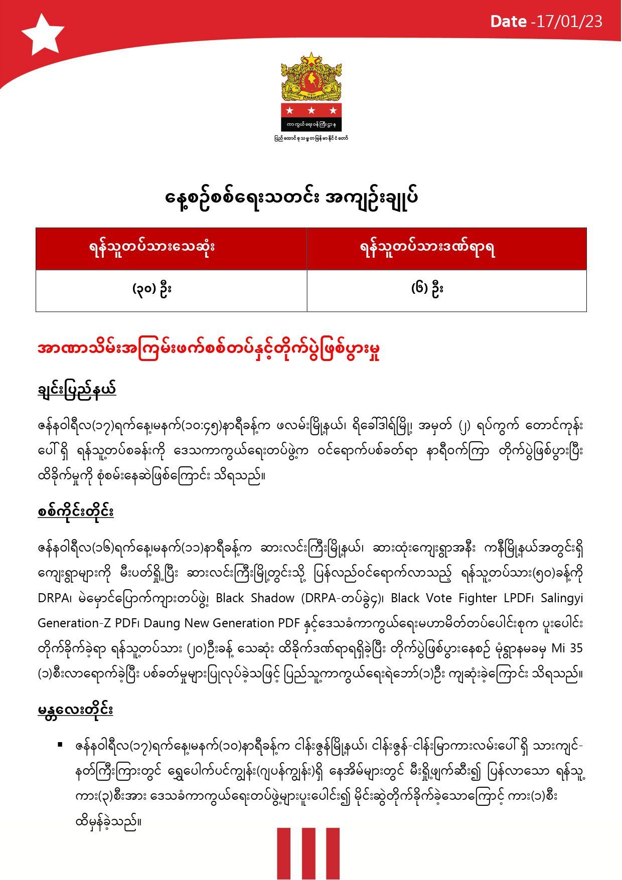 မှတ်ချက်။ ။ မြေပြင်သတင်းတာဝန်ခံများနှင့်သတင်းဌာနများမှ ဖော်ပြလာသော အချက်အလက်များအပေါ် အခြေခံပြုစုထားသည်။