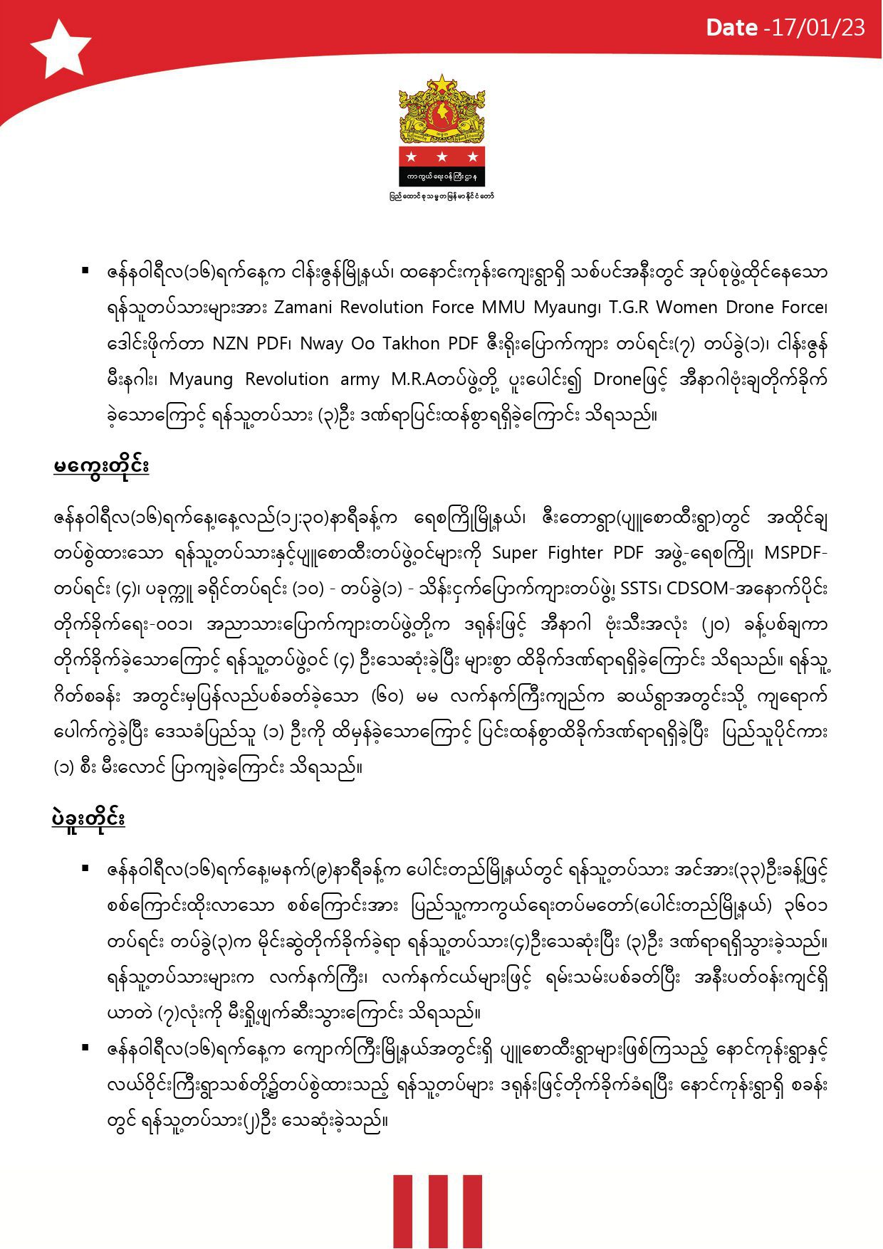 အမျိုးသားညီညွတ်ရေးအစိုးရ၊ ကာကွယ်ရေးဝန်ကြီးဌာနက ထုတ်ဝေသော နေ့စဉ်စစ်ရေးသတင်းအကျဉ်းချုပ်။
