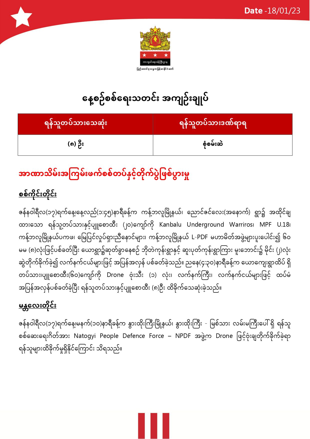 အမျိုးသားညီညွတ်ရေးအစိုးရ၊ ကာကွယ်ရေးဝန်ကြီးဌာနက ထုတ်ဝေသော နေ့စဉ်စစ်ရေးသတင်းအကျဉ်းချုပ်။