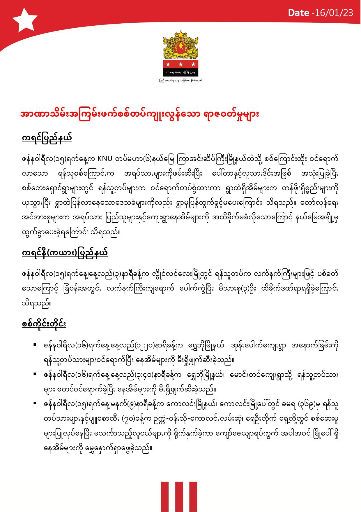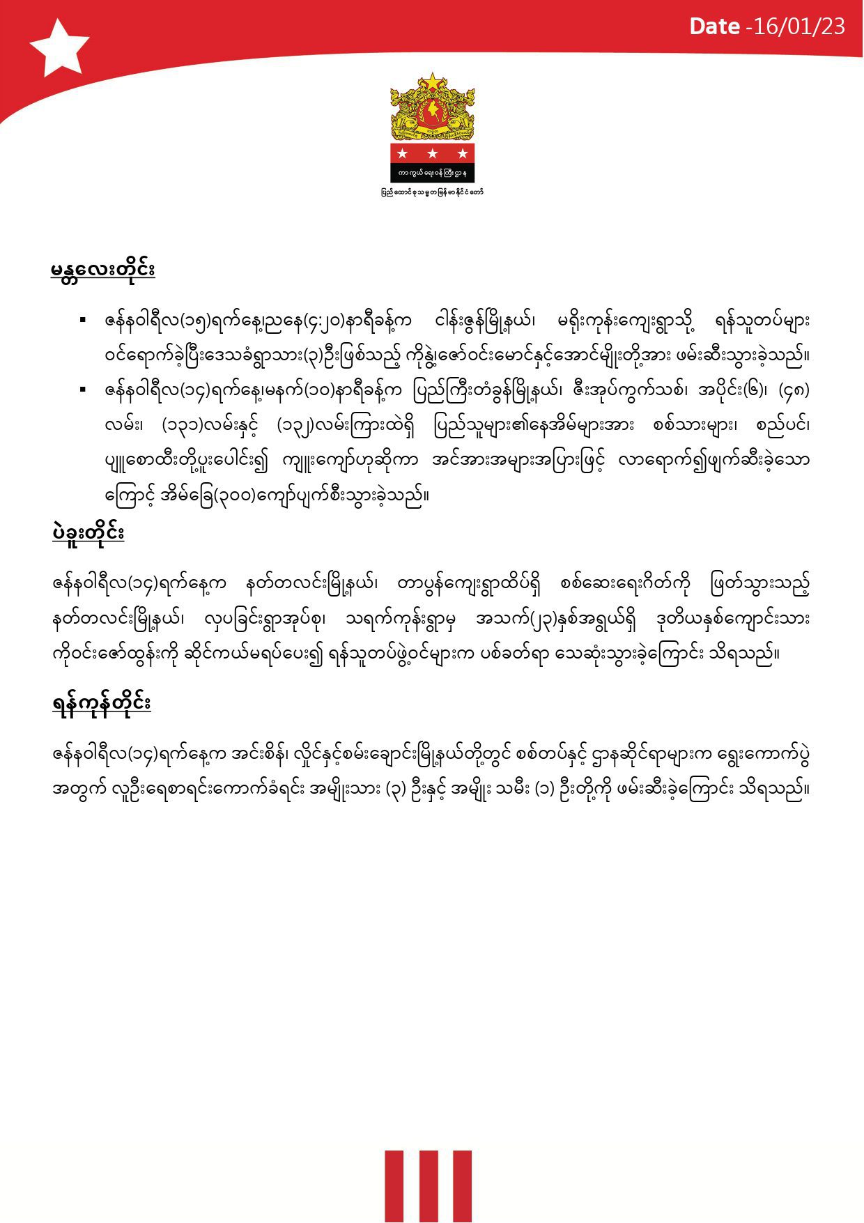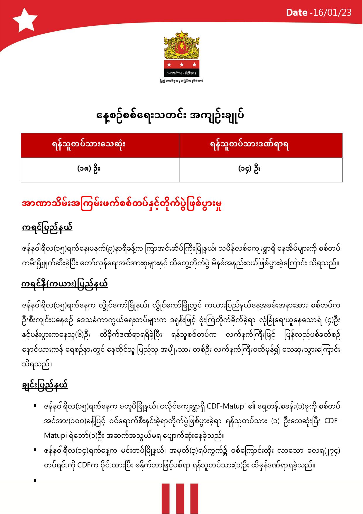 မှတ်ချက်။ ။ မြေပြင်သတင်းတာဝန်ခံများနှင့်သတင်းဌာနများမှ ဖော်ပြလာသော အချက်အလက်များအပေါ် အခြေခံပြုစုထားသည်။