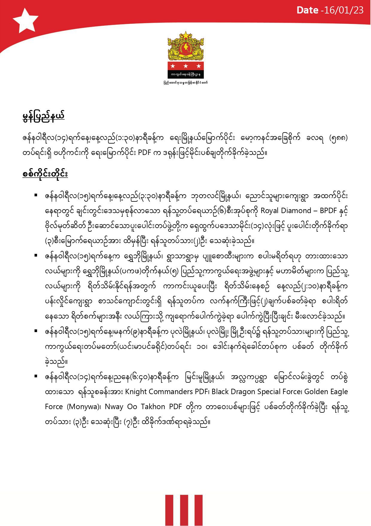 အမျိုးသားညီညွတ်ရေးအစိုးရ၊ ကာကွယ်ရေးဝန်ကြီးဌာနက ထုတ်ဝေသော နေ့စဉ်စစ်ရေးသတင်းအကျဉ်းချုပ်။