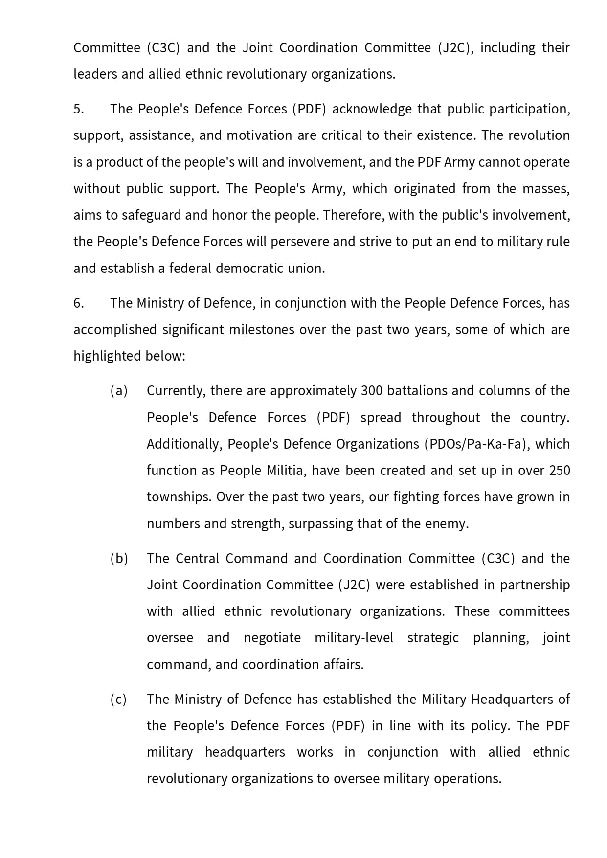(a) Currently, there are approximately 300 battalions and columns of the People’s Defence Forces (PDF) spread throughout the country. Additionally, People’s Defence Organizations (PDOs/Pa-Ka-Fa), which function as People Militia, have been created and set up in over 250 townships. Over the past two years, our fighting forces have grown in numbers and strength, surpassing that of the enemy.