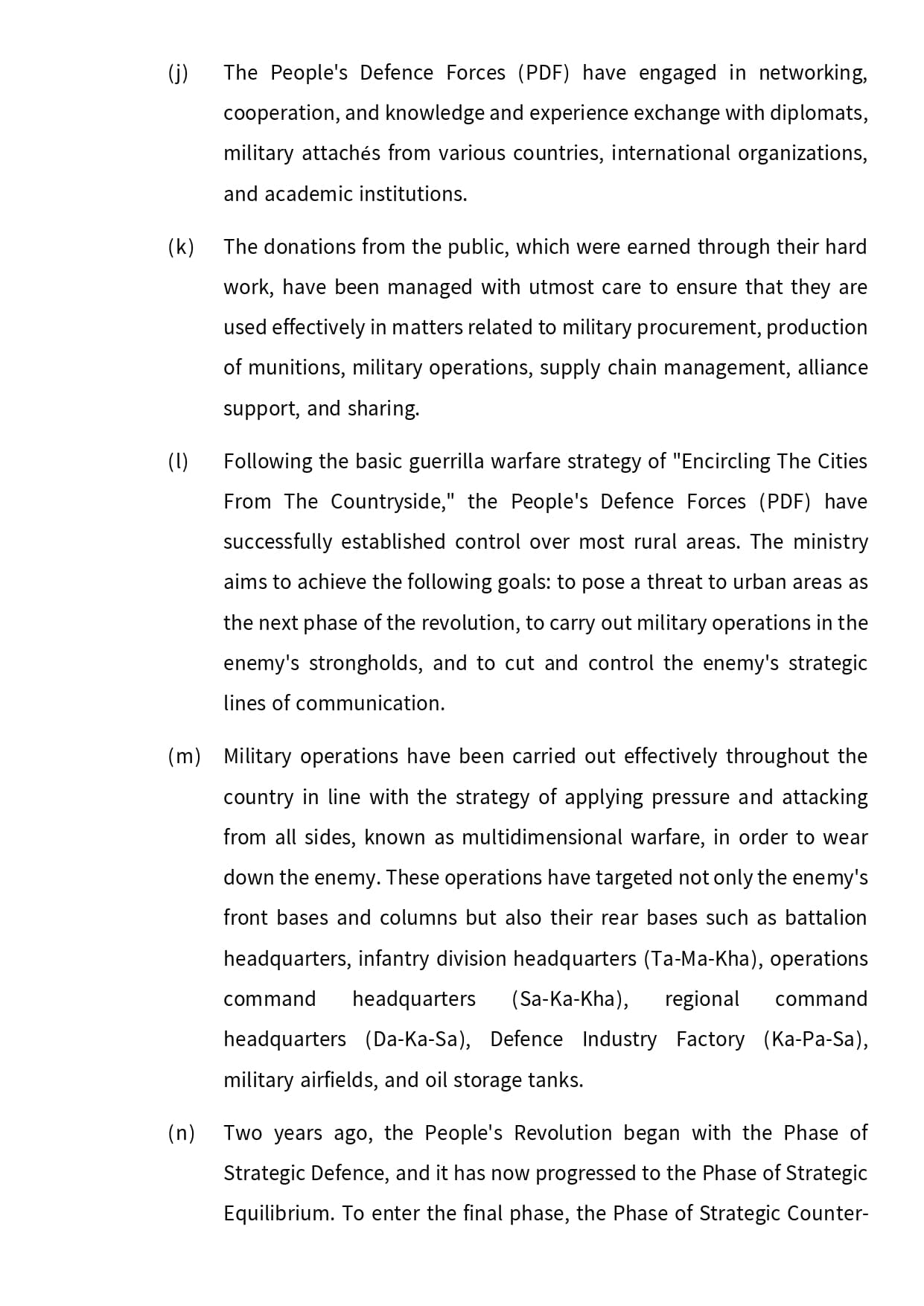 (l) Following the basic guerrilla warfare strategy of “Encircling The Cities From The Countryside,” the People’s Defence Forces (PDF) have successfully established control over most rural areas. The ministry aims to achieve the following goals: to pose a threat to urban areas as the next phase of the revolution, to carry out military operations in the enemy’s strongholds, and to cut and control the enemy’s strategic lines of communication.