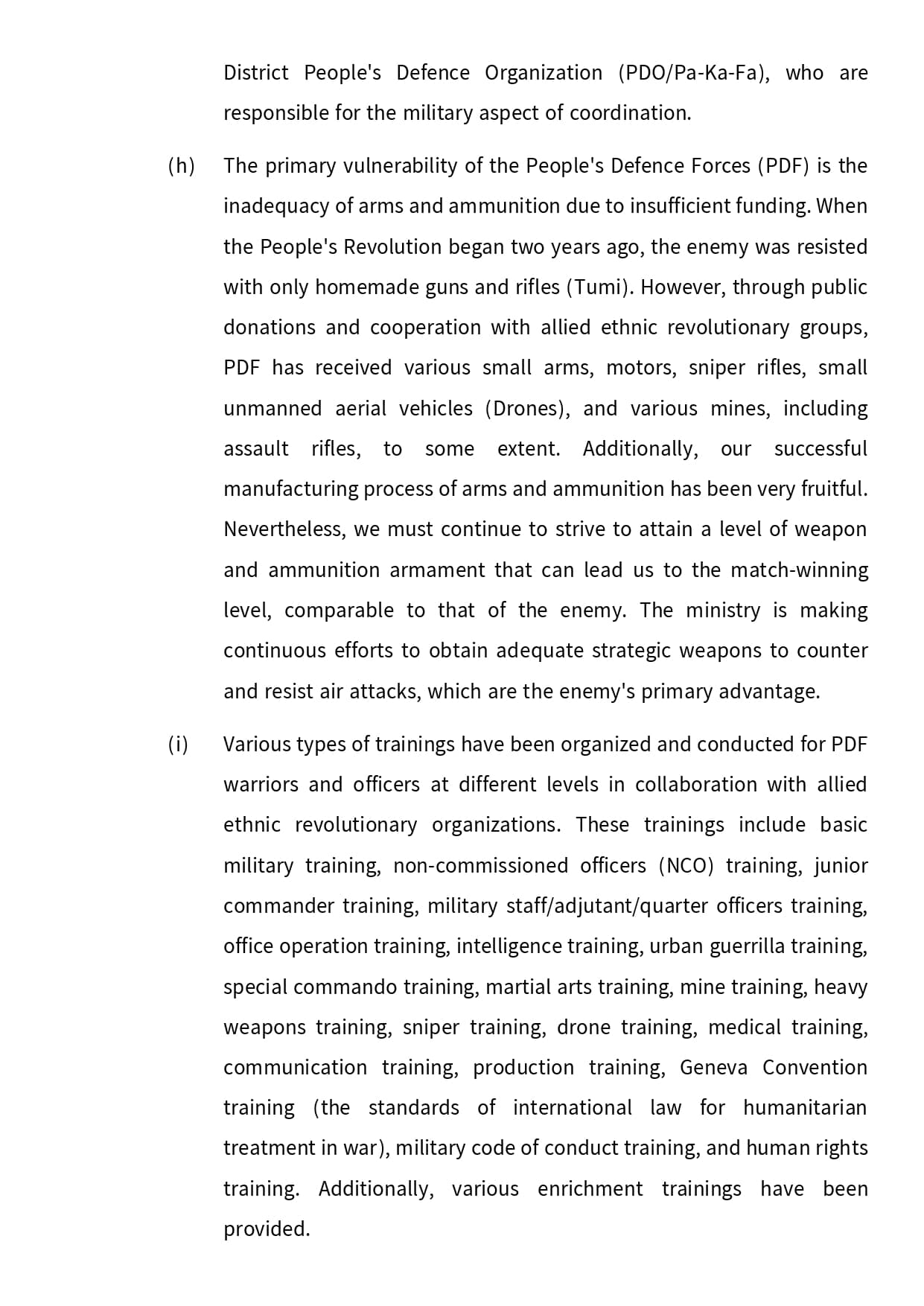 (i) Various types of trainings have been organized and conducted for PDF warriors and officers at different levels in collaboration with allied ethnic revolutionary organizations. These trainings include basic military training, non-commissioned officers (NCO) training, junior commander training, military staff/adjutant/quarter officers training, office operation training, intelligence training, urban guerrilla training, special commando training, martial arts training, mine training, heavy weapons training, sniper training, drone training, medical training, communication training, production training, Geneva Convention training (the standards of international law for humanitarian treatment in war), military code of conduct training, and human rights training. Additionally, various enrichment trainings have been provided.