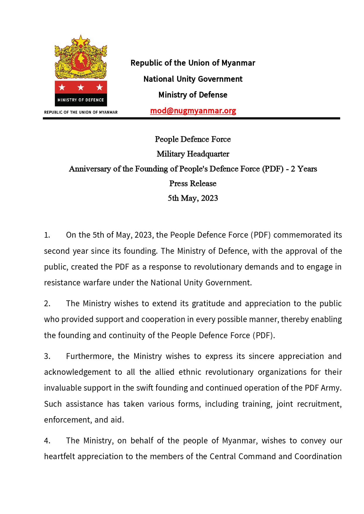 2. The Ministry wishes to extend its gratitude and appreciation to the public who provided support and cooperation in every possible manner, thereby enabling the founding and continuity of the People Defence Force (PDF).