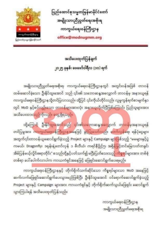 ၂၀၂၅ ခုနှစ်၊ ဖေဖော်ဝါရီလ (၁၀) ရက်နေ့ဆိုရှယ်မီဒီယာများတွင် ပျံ့နှံ့နေသော အထက်ပါ စာများသည် အတုများဖြစ်ကြောင်း အသိပေးအပ်ပါသည်။ကာကွယ်ရေးဝန်ကြီးဌာနအမျိုးသားညီညွတ်ရေးအစိုးရ