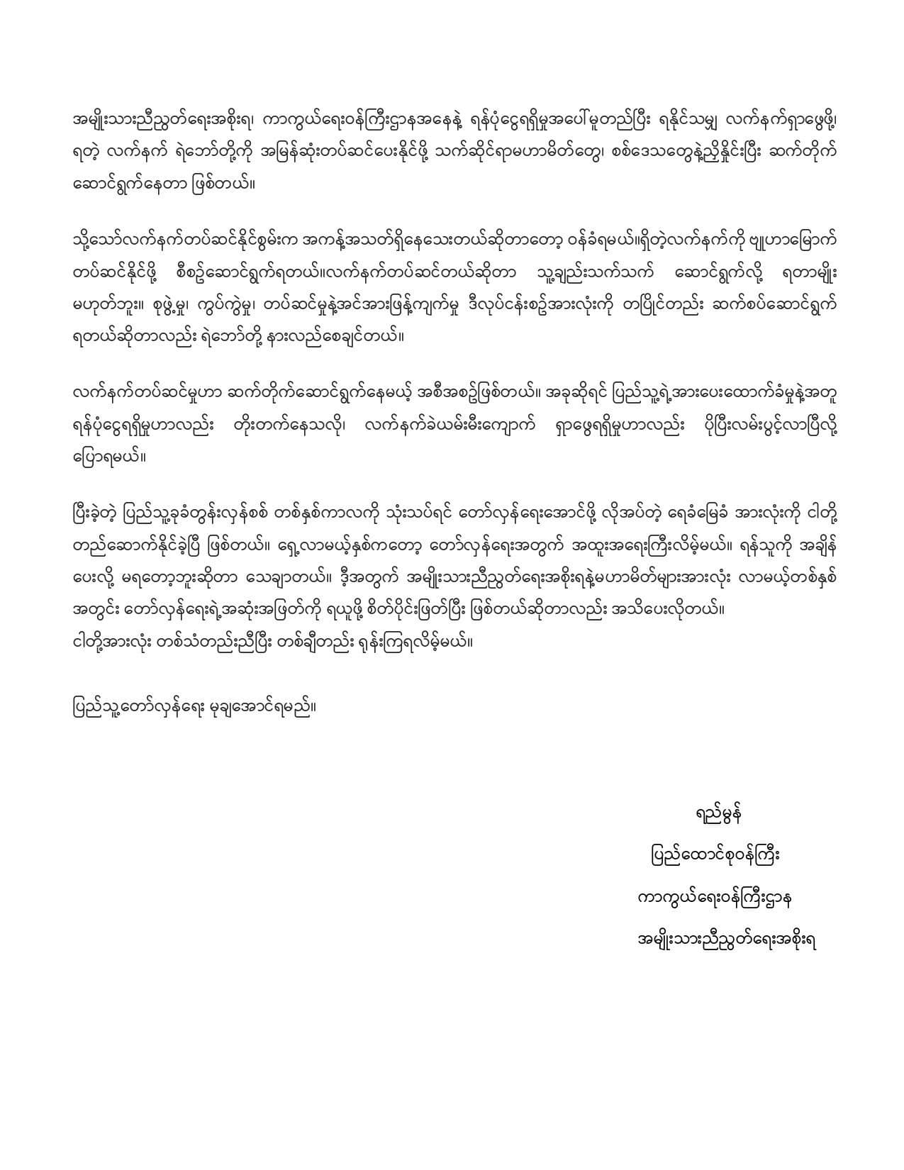 အထူးသဖြင့် ငါတို့အားလုံး ဦးညွှတ်အလေးပြုရမှာက ငါတို့ပြည်သူတွေရဲ့ဂုဏ်ရောင်ပြောင်တဲ့ တော်လှန်ရေးစိတ်ဓာတ်ပဲ ဖြစ်တယ်။ စစ်ကောင်စီရဲ့အကြမ်းဖက်မှု အမျိုးမျိုးကို ကြံ့ကြံ့ခံပြီး တော်လှန်ရေးမှာ သံဓိဌာန်ရှိရှိ ထောက်ခံပါဝင်နေတဲ့ ငါတို့ ပြည်သူတွေကို တော်လှန်ရေးအောင်ပွဲ ရယူပေးခြင်းအားဖြင့်သာ ငါတို့ကျေးဇူးဆပ်နိုင်ပေလိမ့်မယ်။