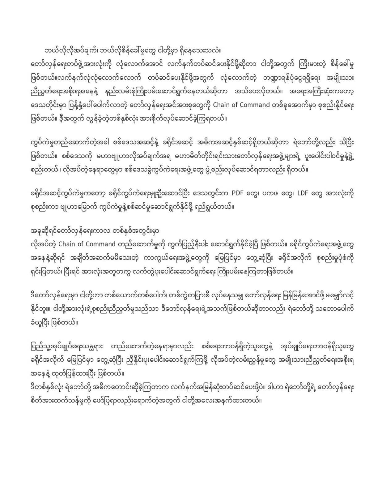 လိုအပ်တဲ့ Chain of Command တည်ဆောက်မှုကို ကွက်ပြည့်နီးပါး ဆောင်ရွက်နိုင်ခဲ့ပြီ ဖြစ်တယ်။ ခရိုင်ကွပ်ကဲရေးအဖွဲ့တွေ အနေနဲ့ဆိုရင် အချိတ်အဆက်မမိသေးတဲ့ ကာကွယ်ရေးအဖွဲ့တွေကို မြေပြင်မှာ တွေ့ဆုံပြီး ခရိုင်အလိုက် စုစည်းမှုပုံစံကို ရှင်းပြတယ်၊ ပြီးရင် အားလုံးအတူတကွ လက်တွဲပူးပေါင်းဆောင်ရွက်ရေး ကြိုးပမ်းနေကြတာဖြစ်တယ်။