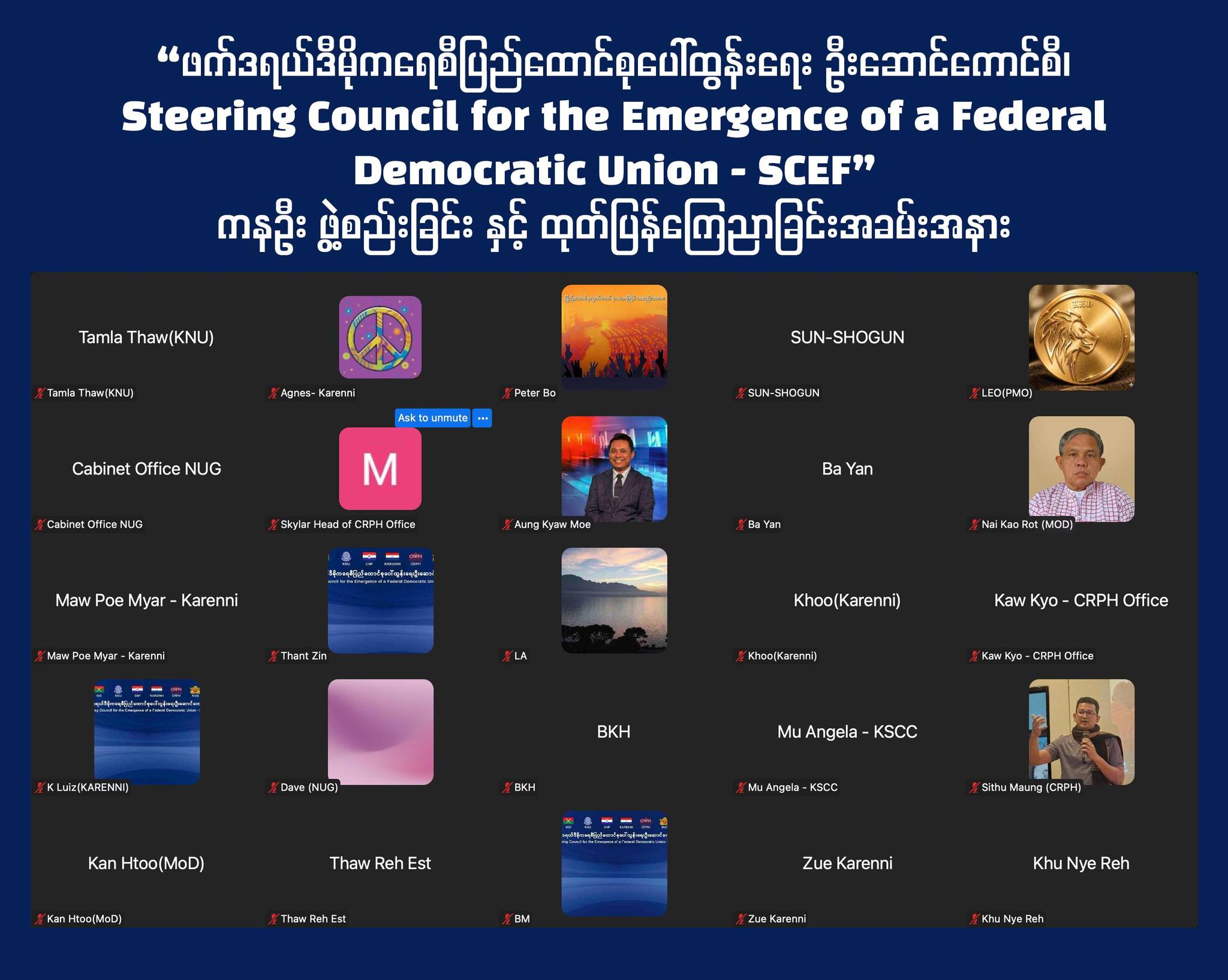 ယနေ့ ၂၀၂၆ ခုနှစ် မတ်လ ၃၀ ရက်နေ့ တွင် “ဖက်ဒရယ်ဒီမိုကရေစီပြည်ထောင်စုပေါ်ထွန်းရေး ဦးဆောင်ကောင်စီ၊ Steering Council for the Emergence of a Federal Democratic Union – SCEF” ကနဦး ဖွဲ့စည်းခြင်း နှင့် ထုတ်ပြန်ကြေညာခြင်းအခမ်းအနားကို ကျင်းပပြုလုပ်ခဲ့သည်။