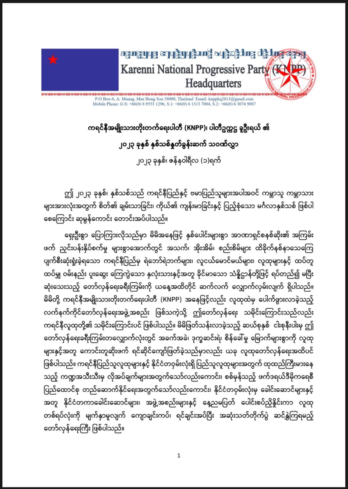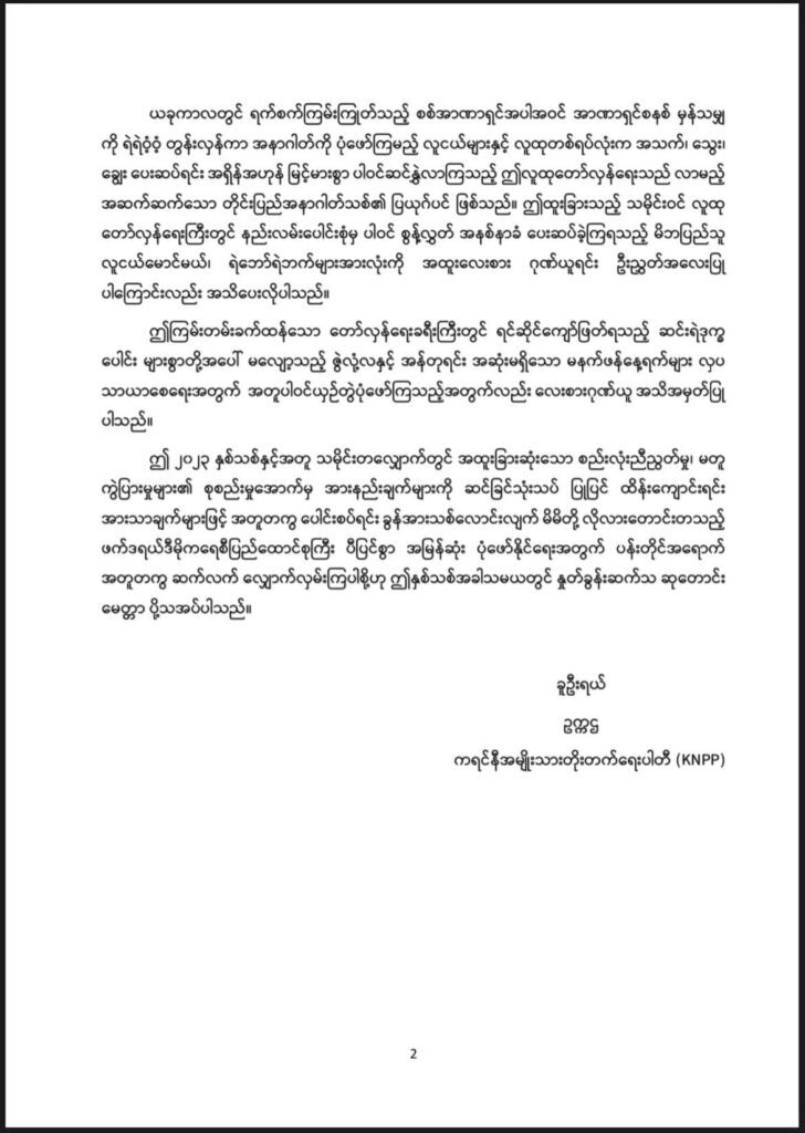“ဤ ၂၀၂၃ နှစ်သစ်နှင့်အတူ သမိုင်းတလျှောက်တွင် အထူးခြားဆုံးသော စည်းလုံးညီညွတ်မှု၊ မတူ ကွဲပြားမှုများ၏ စုစည်းမှုအောက်မှ အားနည်းချက်များကို ဆင်ခြင်သုံးသပ် ပြုပြင် ထိန်းကျောင်းရင်း အားသာချက်များဖြင့် အတူတကွ ပေါင်းစပ်ရင်း ခွန်အားသစ်လောင်းလျက် မိမိတို့ လိုလားတောင်းတသည့် ဖက်ဒရယ်ဒီမိုကရေစီပြည်ထောင်စုကြီး ပီပြင်စွာ အမြန်ဆုံး ပုံဖော်နိုင်ရေးအတွက် ပန်းတိုင်အရောက် အတူတကွ ဆက်လက် လျှောက်လှမ်းကြပါစို့ …”